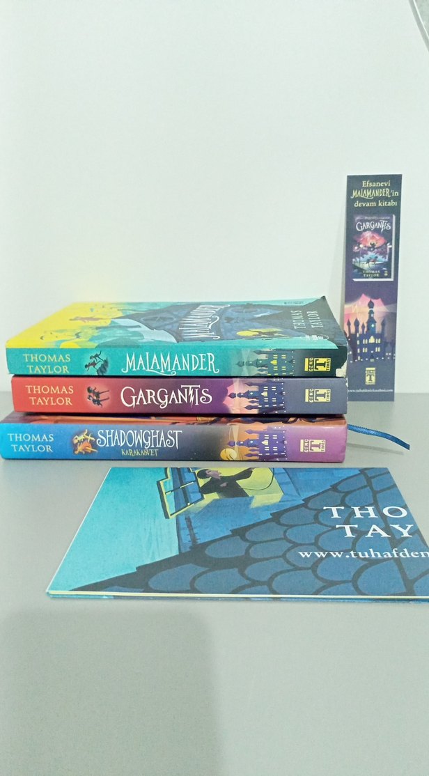 Thomas Taylor'ın Maiamander, Gargantis ve Shadowghast romanlarından oluşan renkli kapaklı kitap seti.