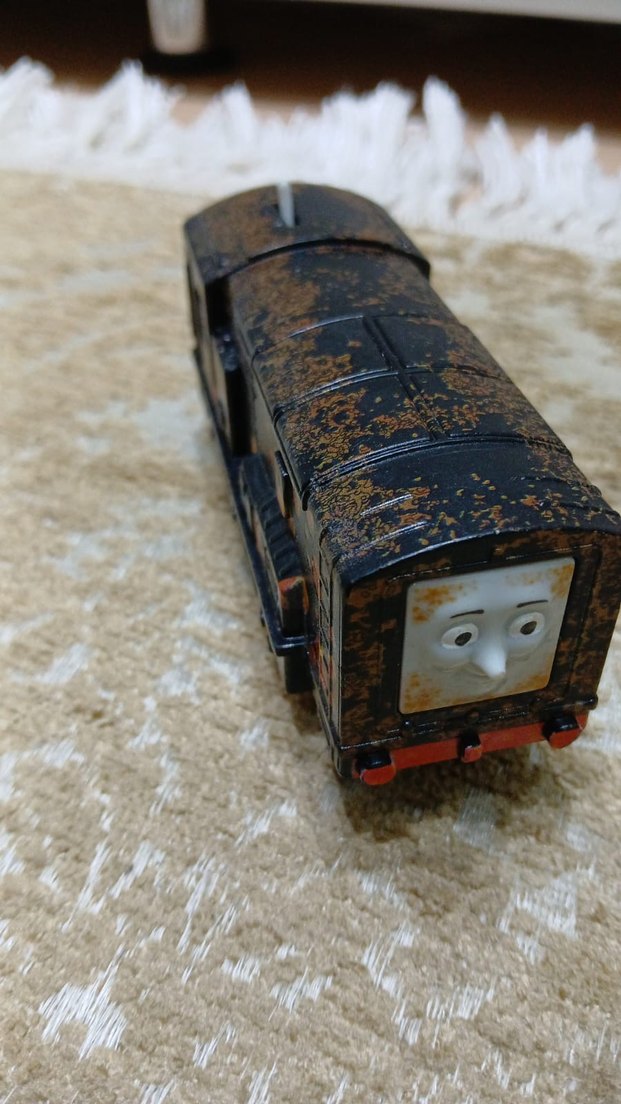 Kahverengi ve koyu tonlarda yüz detaylı tren karakteri figürü, gerçekçi aşınma efektleriyle dikkat çekiyor. Thomas tren ender tür