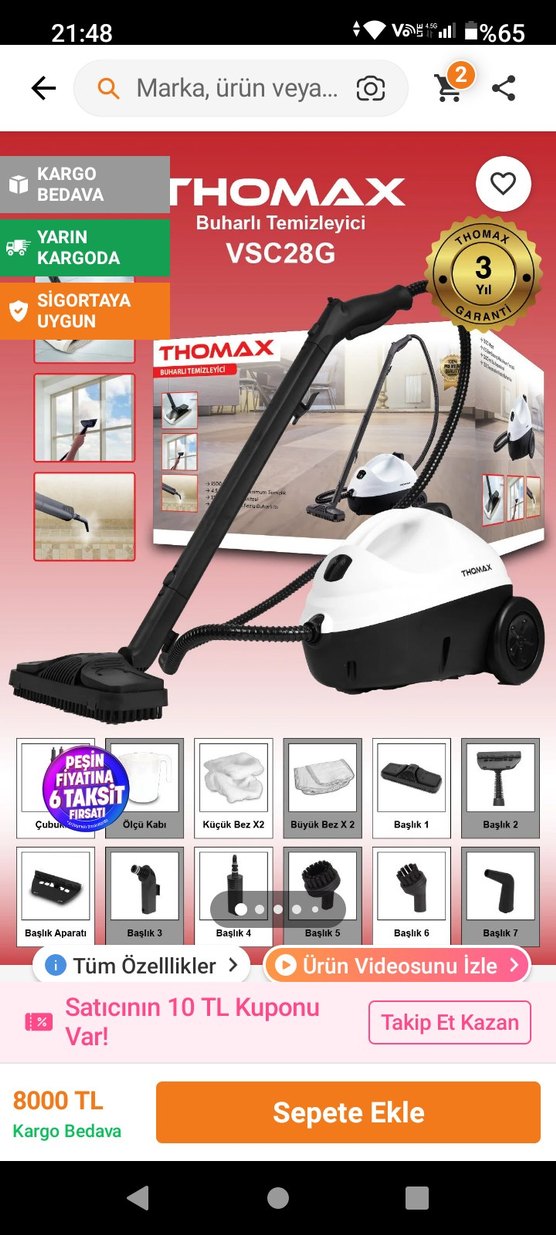 Thomax VSC28G buharlı temizleyici beyaz renkte, küçük ve büyük bezler ile 7 farklı başlığa sahip. 3 yıl garanti ve taksit seçeneği sunar.