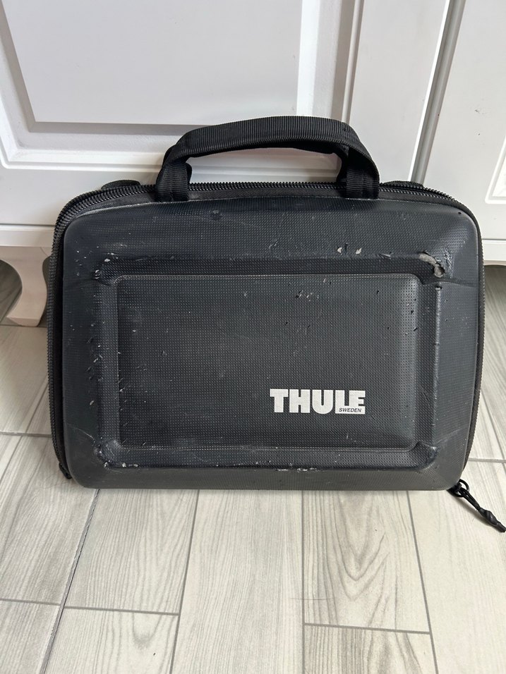 Thule markalı siyah , fermuarlı kapanışa ve baskılı logoya sahip bilgisayar çantasıdır. Dış kısmı gerçekten çok kötü durumdafır ama içinde hiçbir sorun yoktur.