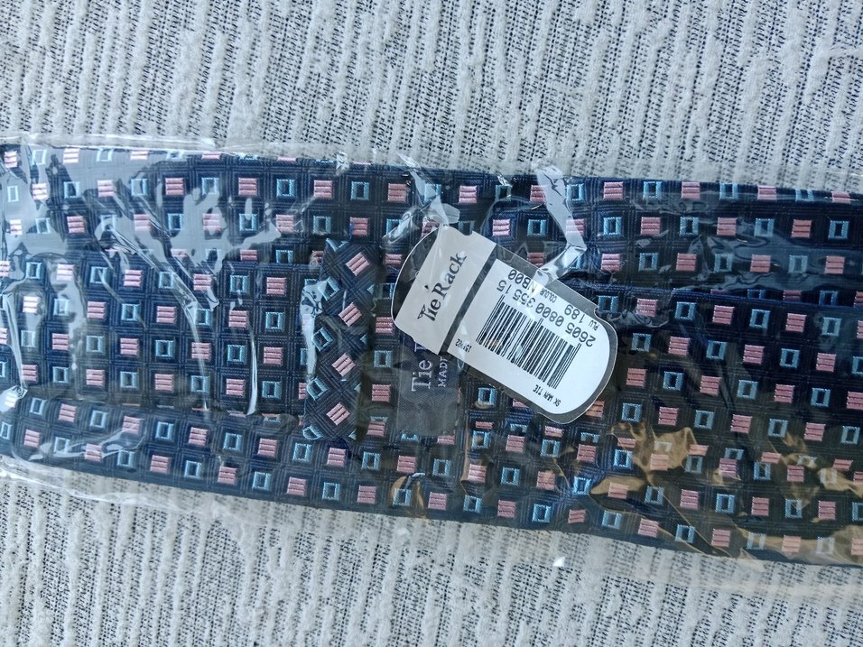 Gri ve pembe tonlarında geometrik kare desenli mavi erkek kravat, Tie Rack etiketli ve plastik ambalajda. 2013 yılında fes edilmiş bir firma olduğu için koleksiyonluk bir parçadır.
