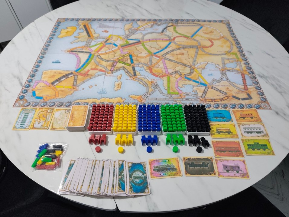 trenler istasyonlar ve tokenler 3D baskı ile üretilmiştir üçer tane yedek tren bulunmaktadır trenler için 5 adet organizer ilave edilmiştir tüm kartlar 160 gram a4'e 100 mikron laminasyon kaplıdır oyun tablosu 84 x 54 santimdir 3 parça katlanır laminasyonlu kartondan oluşmaktadır (toplam 9 A4 büyüklüğündedir)
