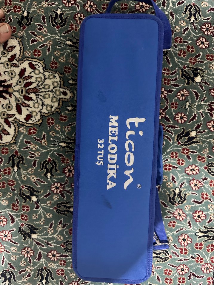 Ticon markalı, koyu mavi renkli, baskılı desenli ve taşıma askılı egzersiz matı. Üzerinde MELODIKA 32TUS yazısı bulunur.