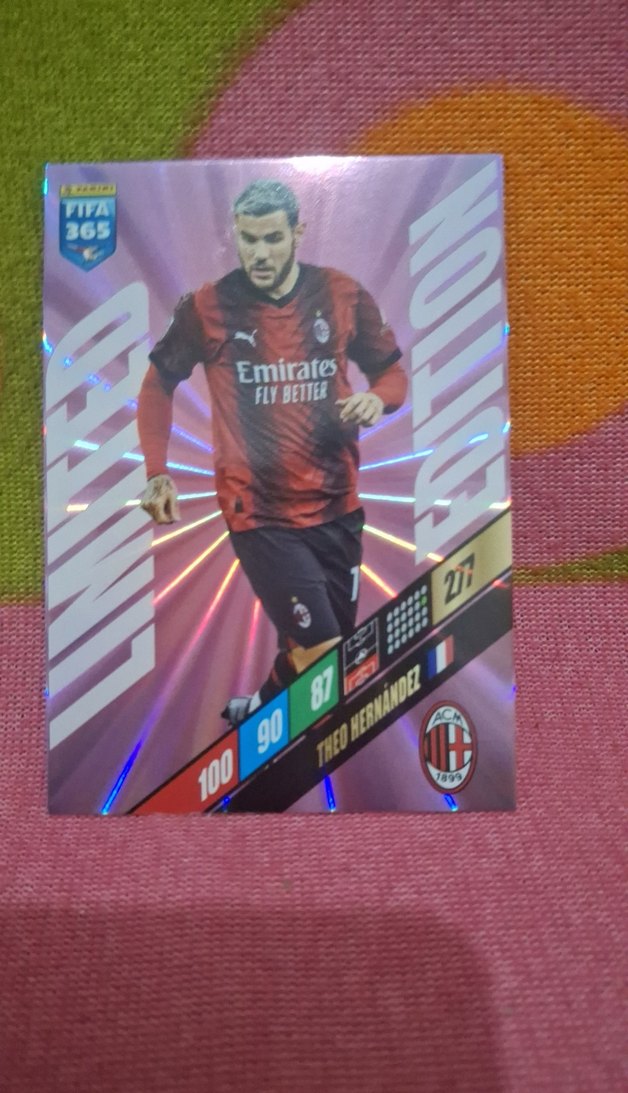Canlı renklerde Tiem Hernandez'in AC Milan formasıyla futbol kartı, FIFA 365 ve Emirates Fly Better logoları ile birlikte. ⚽