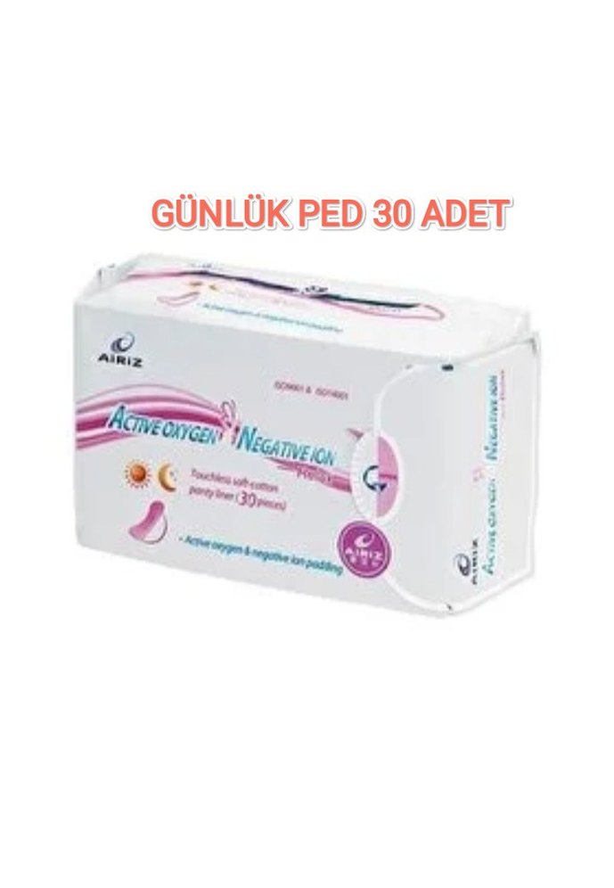 Yumuşak, dokunulmaz pamuklu malzemeden yapılmış, aktif oksijen ve negatif iyon dolgulu 30 adet günlük ped paketi.