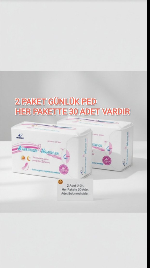 Airiz günlük pedler, 30'lu pakette sunulur. Aktif oksijen ve negatif iyon teknolojisine sahiptir. Yumuşak pamuk dokunuşlu, baskılı pastel pembe renklidir, kısa ve straplez kesimdir, Velcro kapamalıdır. ürün 2 pakettir her pakette 30 adet bulunmaktadır ürün sıfırdır bandrolü üzerindedir