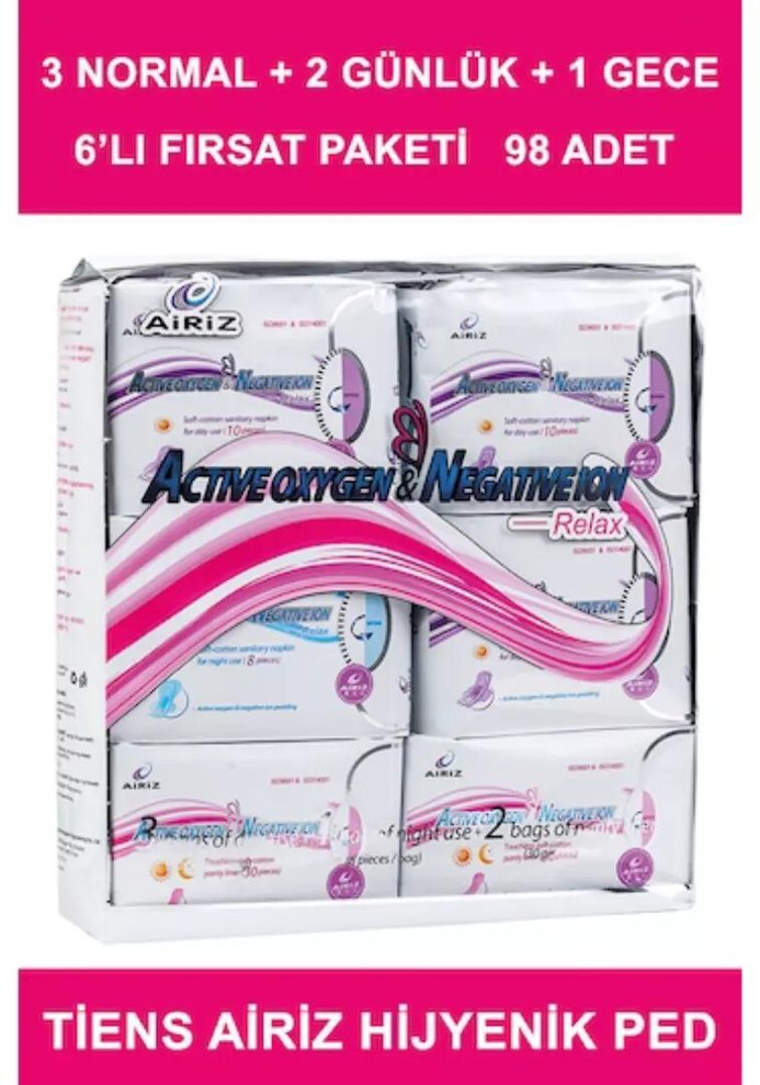 Tiens Airiz hijyenik pedler; 3 normal, 2 günlük ve 1 gece ped olmak üzere toplam 98 adettir. AIRIZ Aktif Oksijen ve Negatif İyon Teknolojisine sahip Hijyenik Pedleri; kadınların regl dönemindeyken her anın tadını çıkarması için hak ettiği özgürlüğü ve güveni sağlamak için tasarlanmıştır. Aktif Oksijen ve Negatif İyonlu Gündüz Pedi, rahatlığınız için tasarlanmış olup vücuda iyi uyum sağlar. 245 mm aktif oksijen ve negatif iyonlu uzatılmış katman, ultra ince tasarımı, süper nem emme özelliği ve sıvıyı pedin içerisinde hapsetmesi sayesinde, size bütün gün boyunca rahatlık sağlar. Airiz Aktif Oksijen ve Negatif İyonlu Gece Pedi, rahatlığınızı ön planda tutarak tasarlanmıştır. Uzatılmış tasarımı, süper nem emiciliği ve sıvıyı pedin içerisinde hapsedebilmesiyle size bütün gece boyunca rahat ve sağlıklı bir uyku saglar. Aktif Oksijen ve Negatif İyonlu Günlük Ped, hipoalerjeniktir. 155 mm aktif oksijen ve negatif iyonlu uzatılmış katman ile günlük kullanım için idealdir.