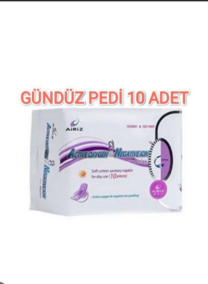 Pamuklu, yumuşak gündüz ped 10 adet paket. Aktif oksijen ve negatif iyon dolgulu, yapışkanlı, pastel mor renkli baskılı tasarım.
