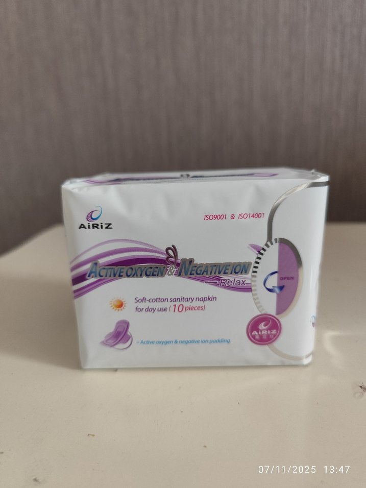 AiRiZ markalı, yumuşak pamuklu hijyenik ped. Aktif oksijen ve negatif iyon dolgusu içerir. günlük 30 lu 200 TL gece 8 li 200 gündüz 10 lu 200 set halinde alınırsa 3 gündüz+1gece+2 günlük kutu ped toplam 1100 TL