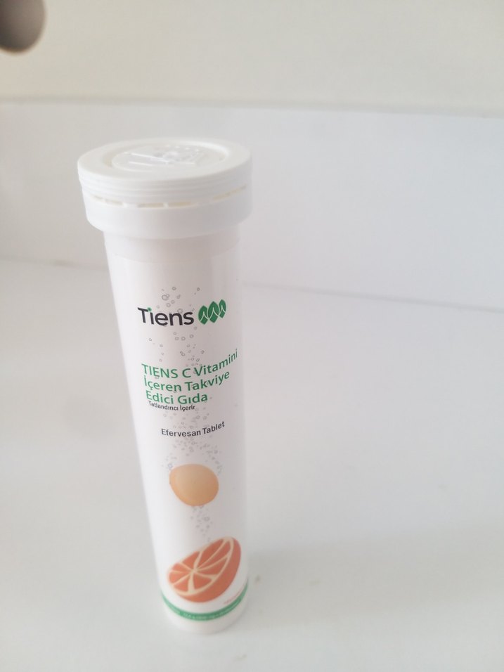 Tiens C Vitamini içeren efervesan tablet, vitamin C takviyesi sağlar. Ürün tüp içinde, etiketinde narenciye görseli bulunur.