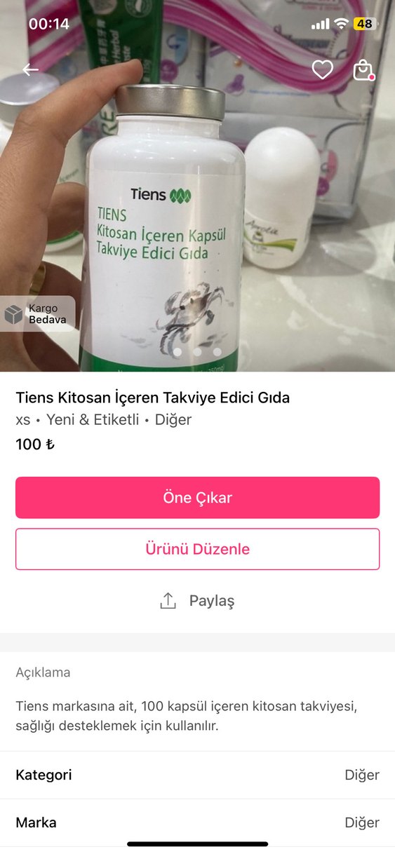 Tiens markasının kitosan içeren takviye edici gıda kapsülleri, sağlığı desteklemek için hazırlanmıştır. Yeni ve etiketli ambalajda sunulmaktadır.