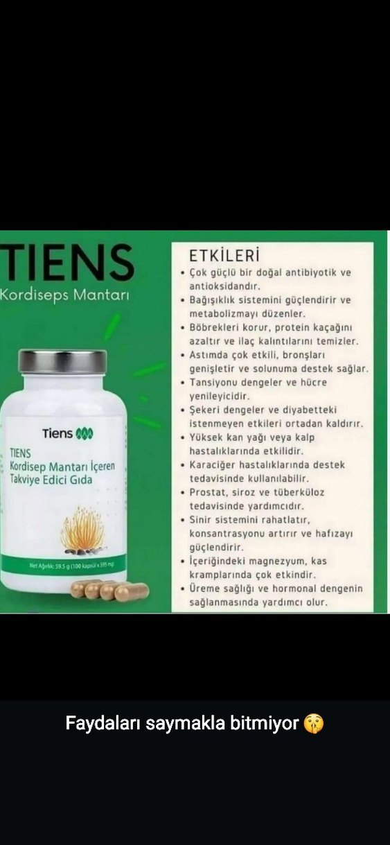 Tiens Kordiseps Mantarı takviyesi, doğal antibiyotik ve antioksidan etkisiyle bağışıklığı güçlendirir, böbrekleri korur, solunuma destek olur, tansiyonu ve şekeri dengeler. Karaciğer ve sinir sistemi sağlığını destekler.