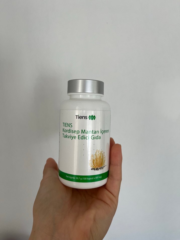 Tiens markalı, kordiseps mantarı içeren takviye edici gıda. Her kapsül 387 mg'dır ve sağlığı desteklemeye yöneliktir.