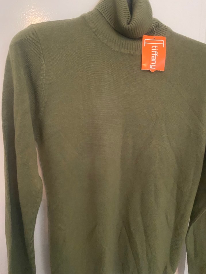 Tiffany markalı kadın kazak, uzun kollu ve balıkçı yaka. Yün kumaştan, yeşil renkte, günlük kullanıma uygun şık ve rahat bir tasarım.