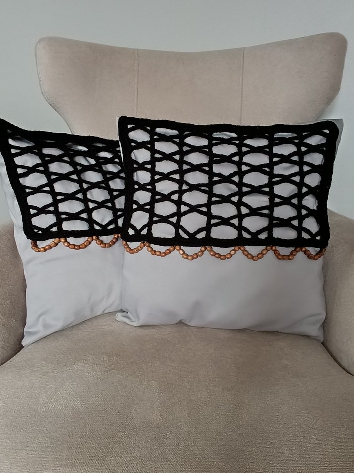 Siyah ve gri renklerde, tığ işi desen ve kahverengi boncuk detaylara sahip dekoratif kırlent kılıfları. ️ 40x40cm