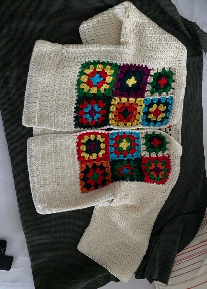 Çeşitli renkli motiflerle bezenmiş harika kısa bir hırka fakir kol