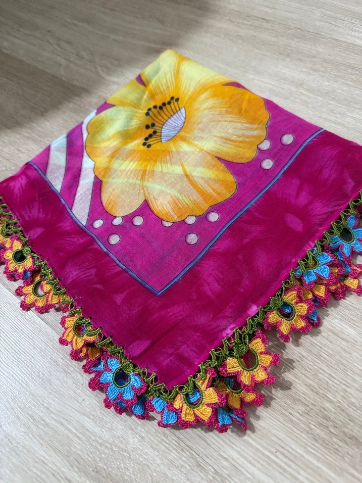 Yumuşak tekstil kumaştan, renkli çiçek desenli ve dantel kenarlı bohem kadın yazması.tığla yapışmıştır.yazmayla oya modeli ve renkleri uyumludur.çeyizlik için renkli bir modeldir
