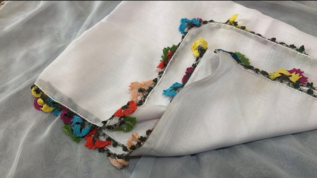 Tığ oyası beyaz yemeni yazma fular