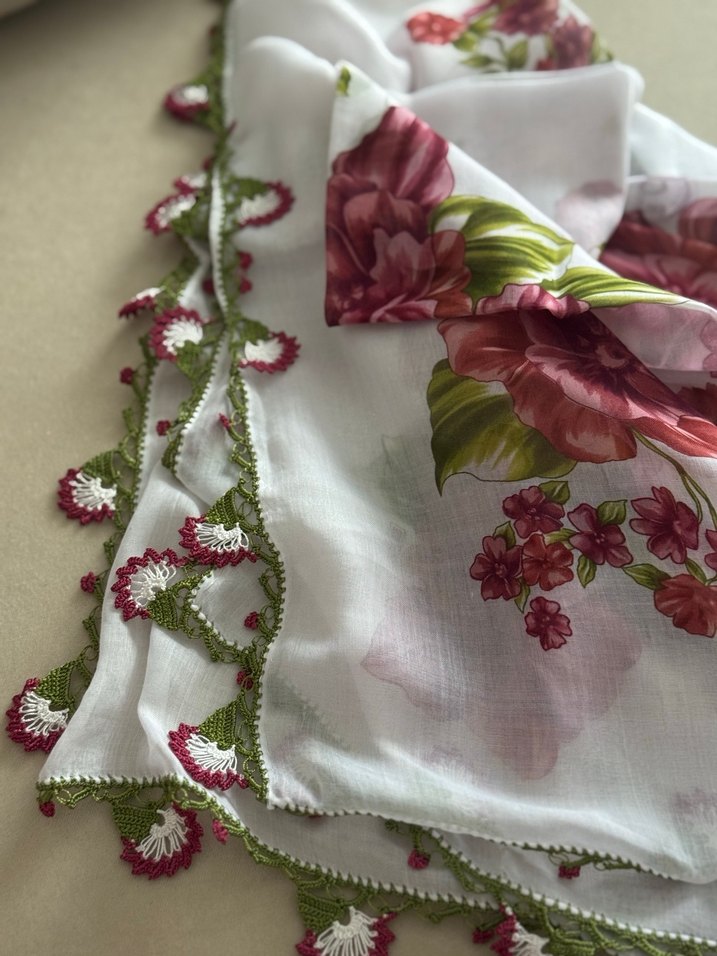 Kadınlar için hafif, çok renkli çiçek desenli, yeşil ve pembe renklerde ince dantel işlemeli fular. Bohem ve retro tarzını yansıtan tekstil kumaş.