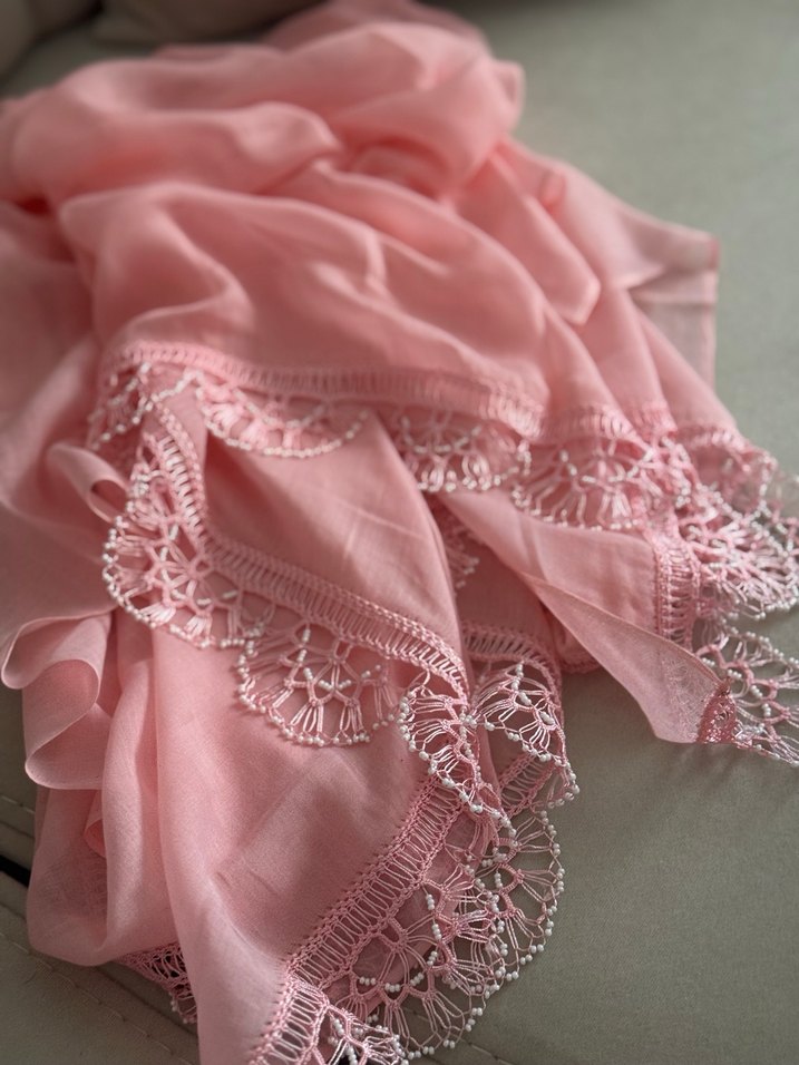 Pastel pembe renkte, dantel detaylı ve ipeksi dokulu kadın fular, bohem tarzı ve klasik zarafeti yansıtıyor.