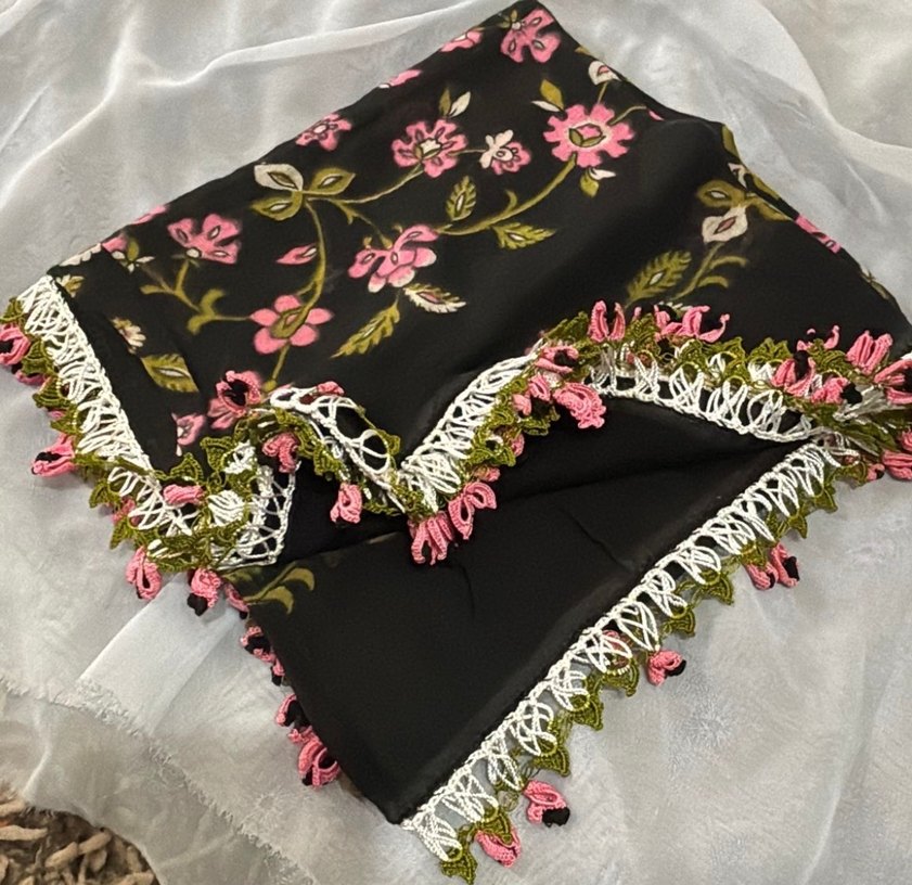 Kadınlar için çok renkli koyu çiçek desenli, tığ oyası kenarlı bohem ve retro tarzda tekstil fular. Yumuşak dokulu, farklı bir hava katmak için ideal.
