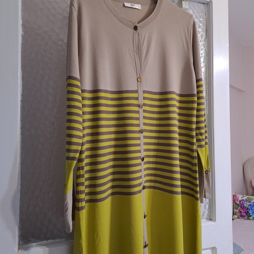 Düğmeli, uzun kesim, uzun kollu ve yuvarlak yaka. Bej ve gri çizgili, canlı sarı detaylı, yumuşak sentetik kumaşla günlük kullanıma uygundur. 42 44 beden uyumludur bir düğmesi düşmüş bulursam eklerim vizon yağ yeşili ve kahve renk geçiş li hırka dır çok iyi durumdadır yeni gibi