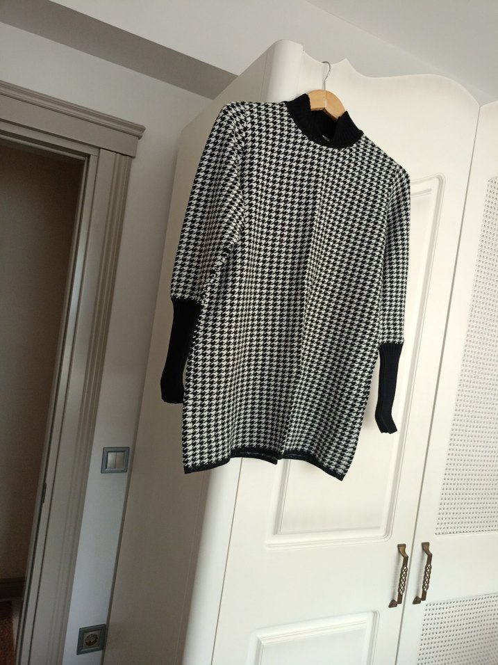 siyah beyaz simli kazayağı desenli, boğazlı ve uzun kollu kadın trikosudur. Midi boyda, bol kesim ve günlük rahat sokak stili için uygundur.