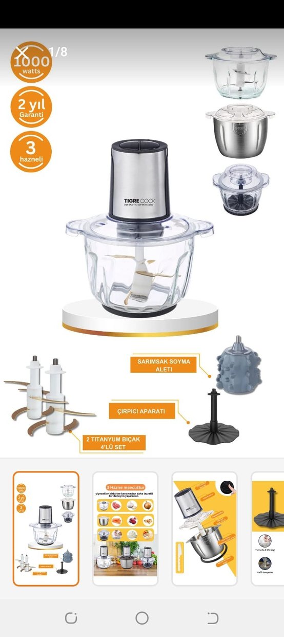Tigre Cook doğrayıcı, üç hazneye sahip olup sarımsak soyma aleti, çırpıcı aparatı ve 4'lü titanyum bıçak seti içerir. Pratik ve dayanıklı kullanım sunar. 2 yıl ek garantisi var. sadece 1 kere kullanıldı