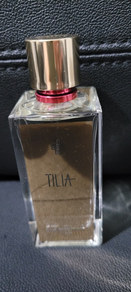 TILIA kadın parfümü, metal kapaklı şeffaf dikdörtgen şişede. Zarif bir koku deneyimi sunar.