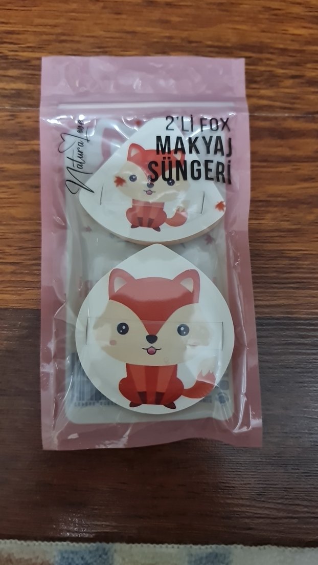 Tilki desenli, açık renk iki adet yumuşak makyaj süngeri, kolay makyaj uygulaması için uygun.