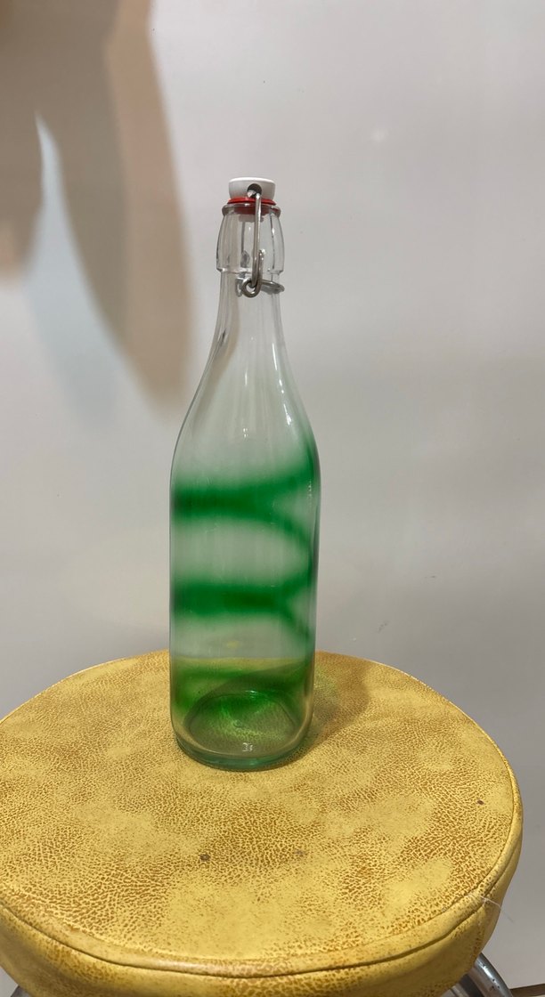 Renkli yeşil degrade desene sahip, kapaklı şeffaf tıpalı su şişesi. 1 litre olması lazım. İçi pis kokmuyor ama tabanında bir iki leke var nasıl cikartiyorlar bilmiyorum.