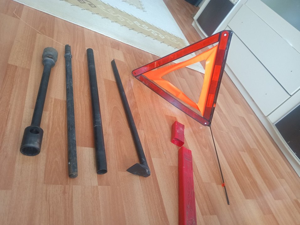 Ahşap zemin üzerinde kırmızı reflektörlü uyarı üçgeni ve birkaç siyah çubuk bulunmaktadır. Üçgen güvenlik uyarısı için kullanılır.