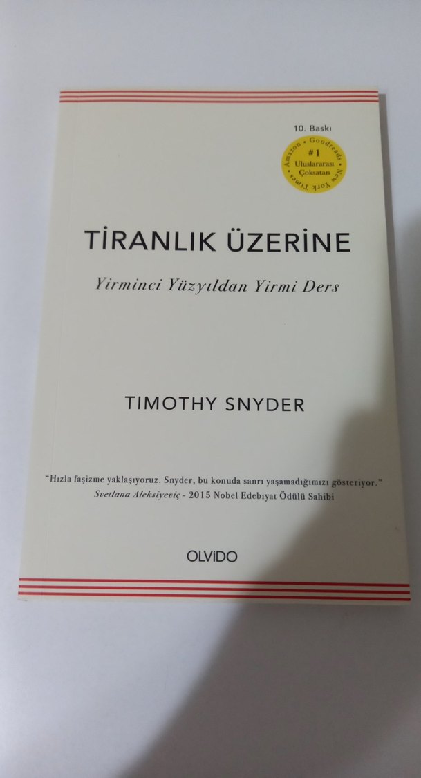 Altı çizili yerler vardır. Timothy Snyder'in "Tiranlık Üzerine" adlı kitabı, yirminci yüzyıldan yirmi ders sunar. Olvido tarafından 10. baskısı yapılmıştır.