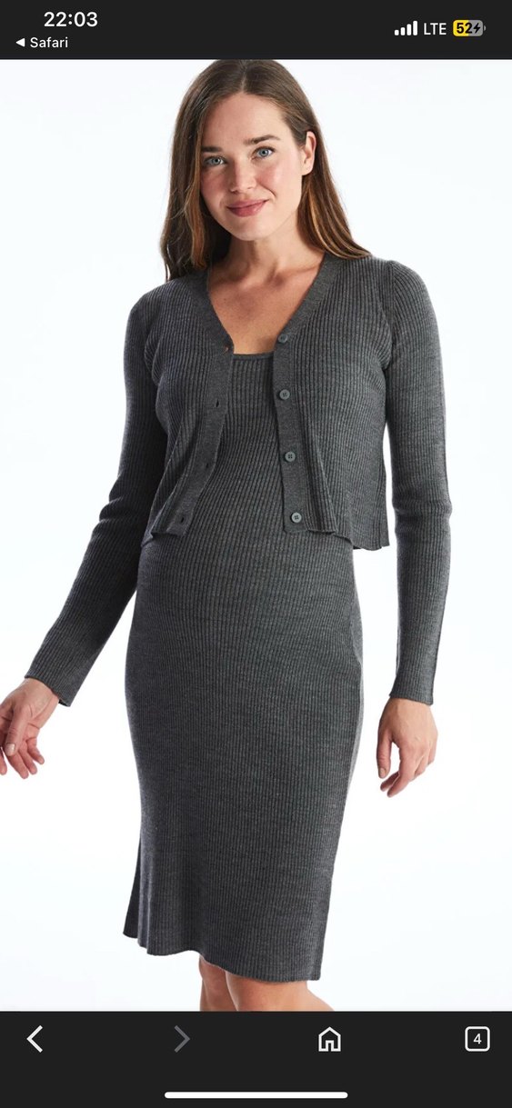 Gri renkli, düğmeli, V yaka ve uzun kollu, fit kesim . Midi boyu ve yumuşak dokusuyla ofis için uygundur. Hırka elbise takım l bedene kadar olur Bir kez giyildi
