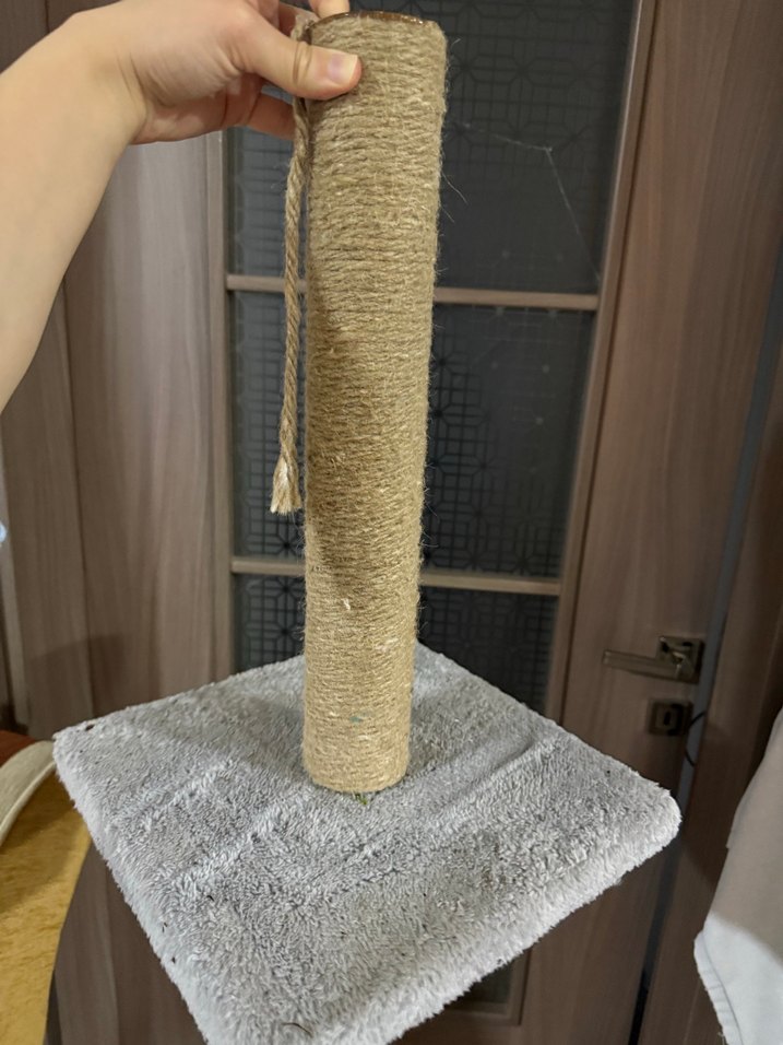 Gri renkte, yumuşak minderli ve doğal ip sarmalı tırmalama direği. Üzerinde asılı oyun ipi bulunur.