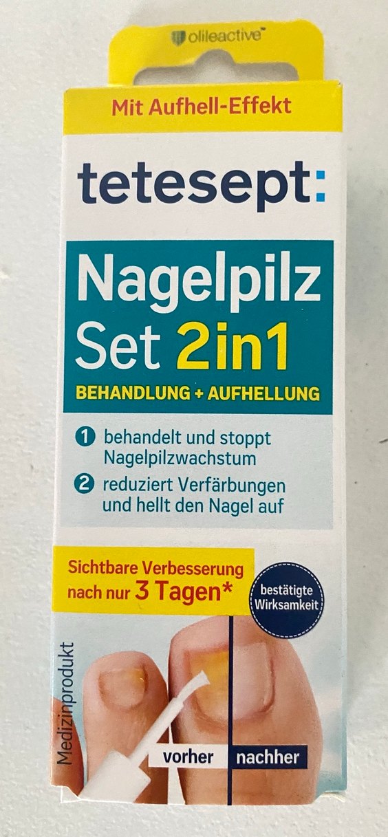 Tetesept 2'si 1 Arada Tırnak Mantar Seti, tırnak mantarının büyümesini durdurur, renk değişikliklerini azaltır ve tırnakları açar. 3 gün içinde görünür iyileşme.