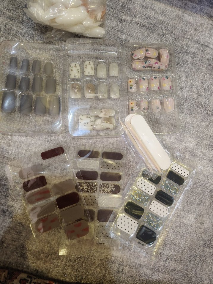 Çeşitli desen ve boyutlarda tırnak süslemeleri seti, tırnak törpüsü ile birlikte gelir.