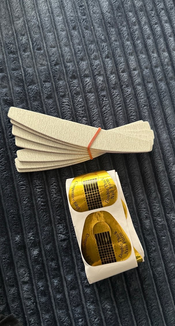 Tırnak şekillendirme ve uzatma için beyaz törpüler ve altın tırnak kalıpları setidir. ✨