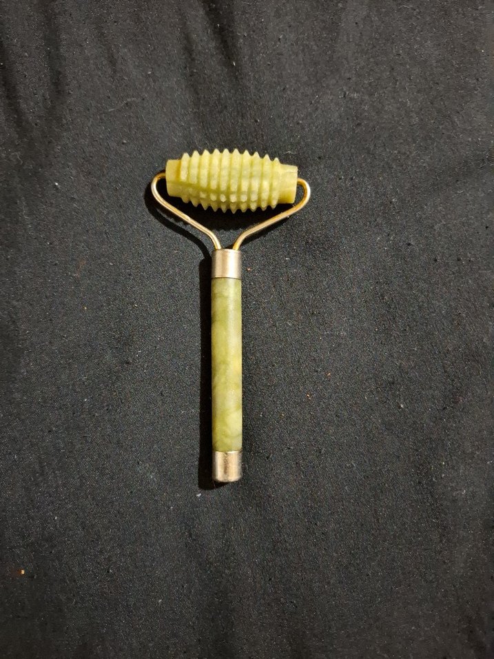 Yüz masajı için tırtıklı yüzeyi olan yeşim taşı rulosu. Sapı ve silindiri yeşim taşından yapılmıştır.