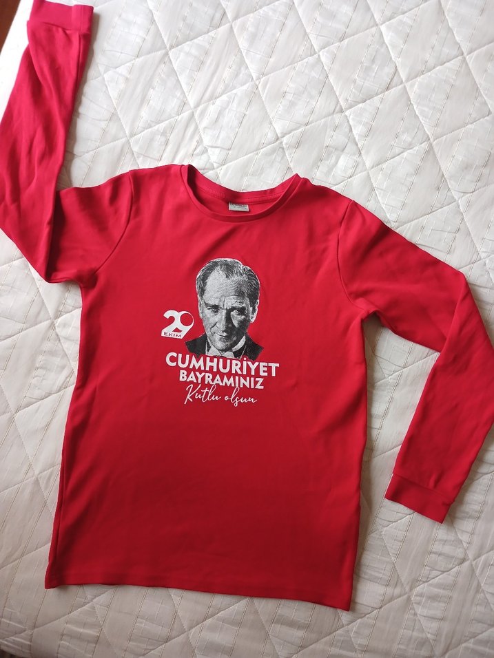 Kırmızı uzun kollu CUMHURİYET BAYRAMI baskılı. Pamuklu, örme kumaş, bol kesim ve normal boyda, günlük kullanıma uygun. 11-12 yaş 146-152 cm ölçülerinde