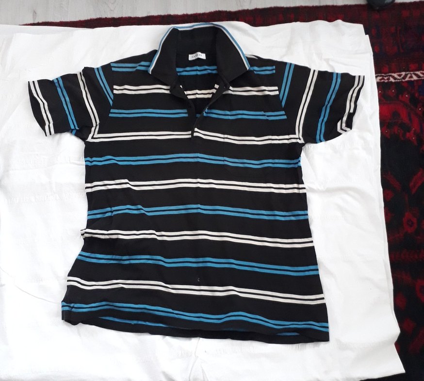 San & Fa marka, polo yakalı L beden erkek tişörtü. İki kol altı arası 51,5 cm, boyu 72,5 cm. Kusuru yoktur.