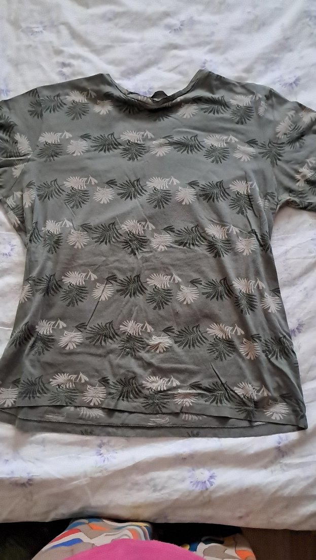 Düğmeli, kısa kollu, gri yaprak desenli tişört Salaş kesim, bisiklet yaka ve normal midi boyda, günlük rahat tarz için uygun