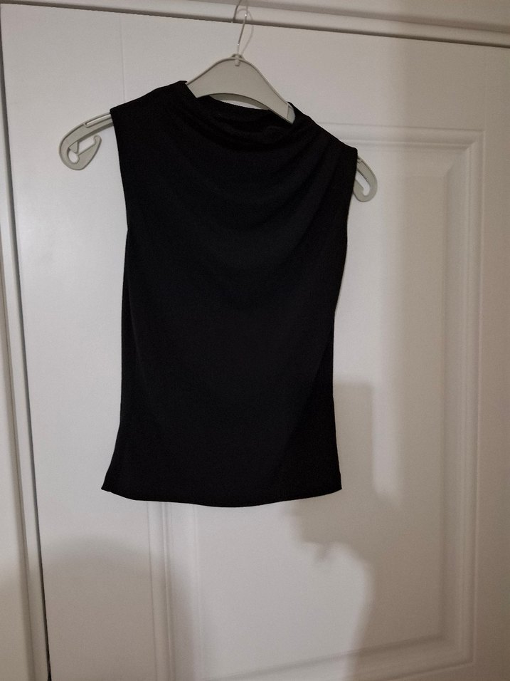 Kolsuz, yüksek yakalı ve dökümlü detaylı siyah kadın bluz. Keten kumaştan, minimalist gotik tarzda, gündelik kullanıma uygun.