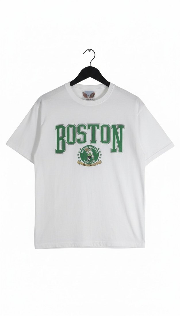 Pamuklu beyaz tişört, kısa kollu ve yuvarlak yakalıdır. Önü Boston baskılıdır, bol kesim ve spor tarzda kullanıma uygundur. ✨