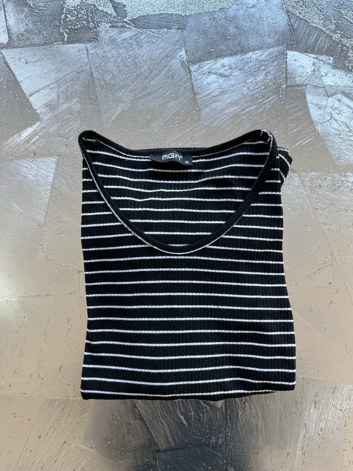 Pamuklu kumaştan, siyah beyaz çizgili, kolsuz ve tekne yakalı, normal boyda dar kesim tişört. Günlük rahat kullanım için uygundur. Bedeni xl olarak yazmıslar ama ben m bedenken giydim