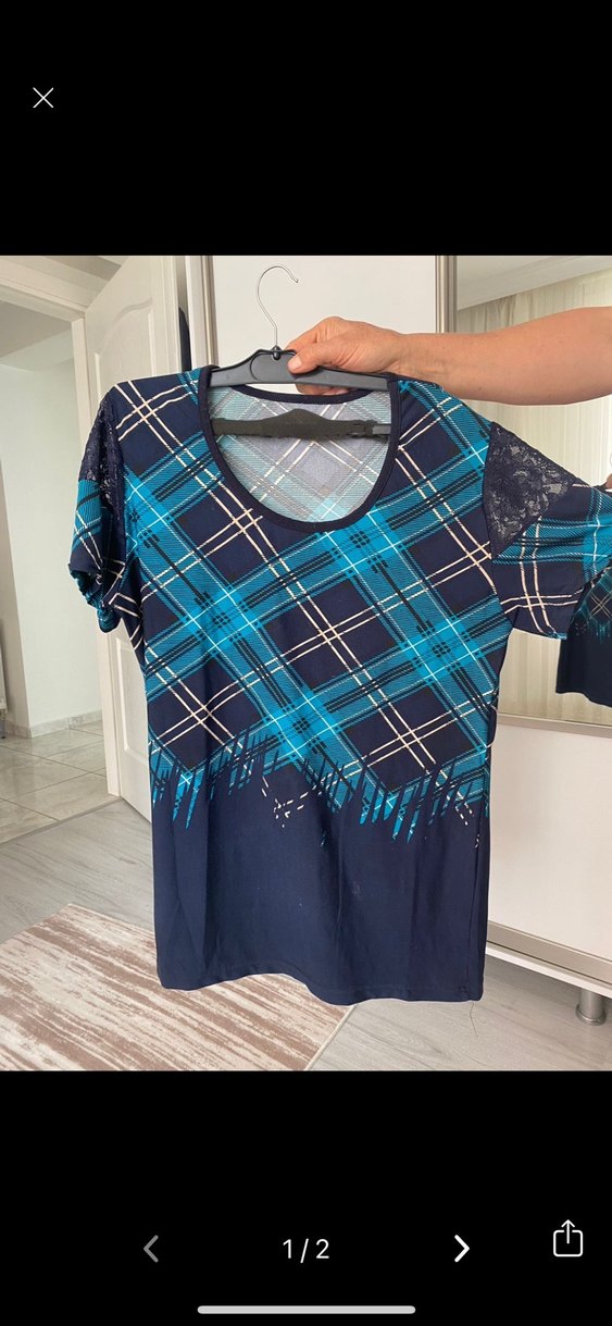 Mavi kareli desene ve salaş kesime sahip, kısa kollu ve bisiklet yaka tişört Günlük rahat kullanıma uygun.