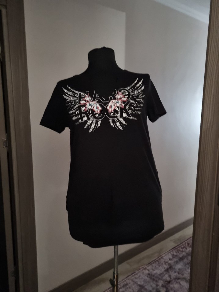 Siyah, kısa kollu, yuvarlak yakalı, payetli rock baskılı kanat desenli oversize kadın tişörtü. Pürüzsüz sentetik kumaştan üretilmiştir.