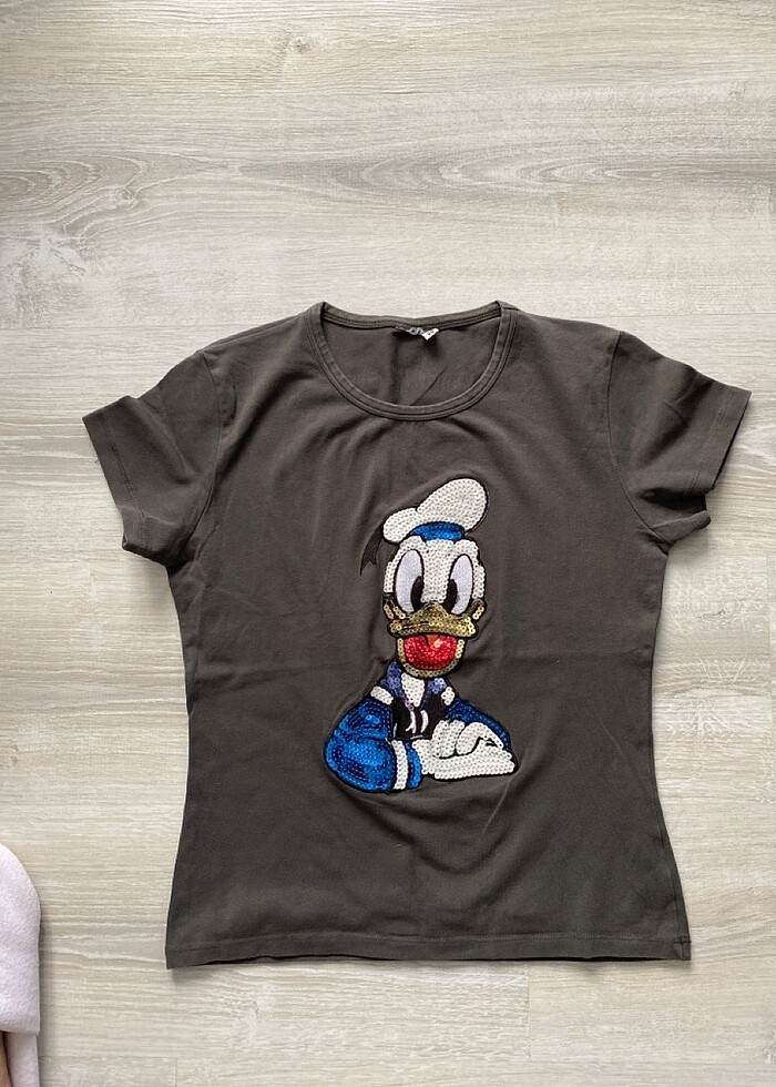 Haki yeşil penye tişört Yıkandı çok az kullanıldı Dar kesim 36 bedene daha uygun Üzerinde 38 beden etiketi var 12-18 yaş arası gençlere uygun Donald Duck pul işlemeli