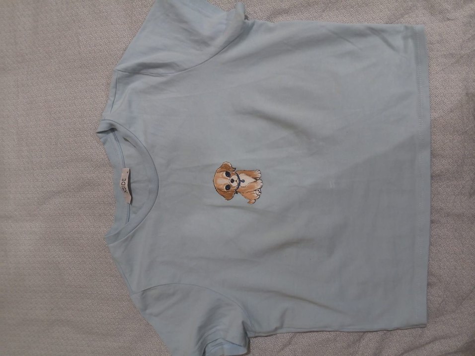 kısa kollu, yuvarlak yakalı crop kesim Yumuşak ve sıcak kumaştan yapılmış, bebek mavisi renkli, baskılı köpek deseni bulunur. Günlük rahat kullanım için uygundur.