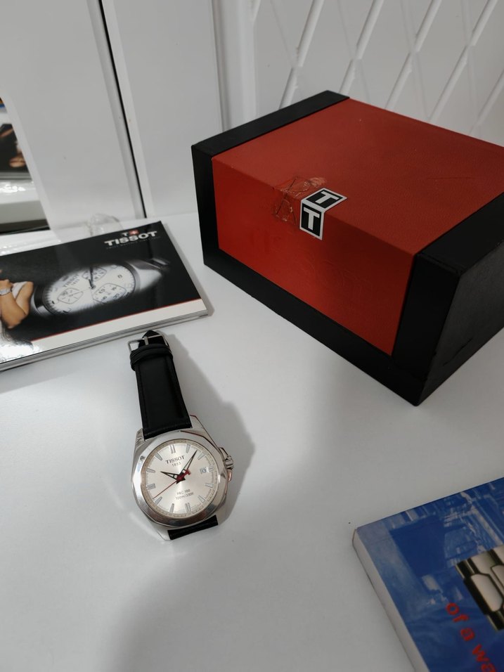 Tissot erkek saati, beyaz kadran ve gri kasa ile modern klasik tarz sunar. Siyah kayışlı ve orijinal kutulu.